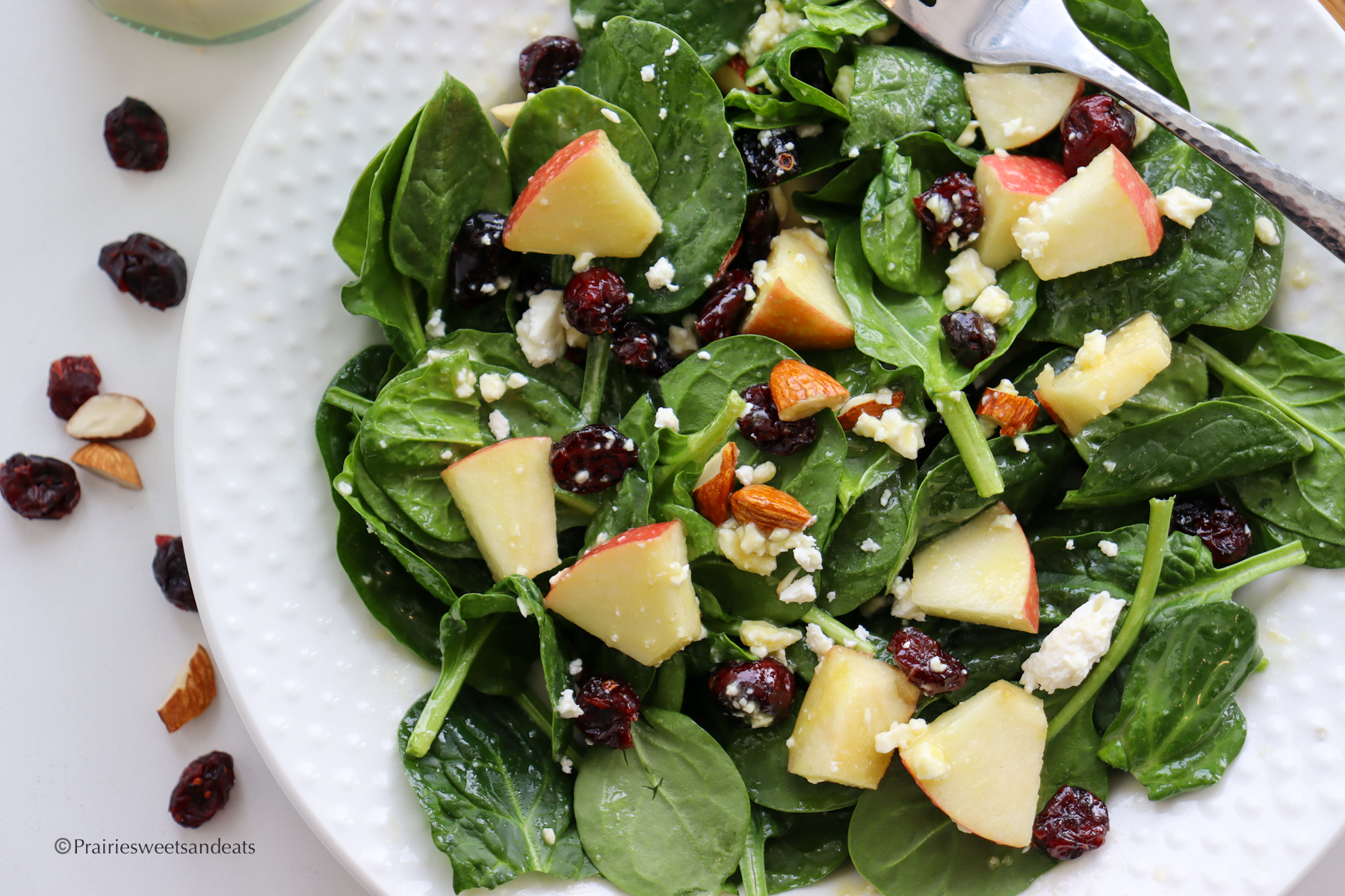 Feel good spinach salad with fresh apples, feta cheese topped with a tangy honey Dijon dressing