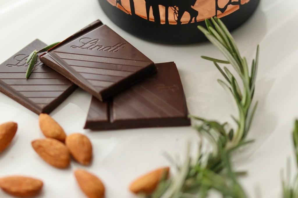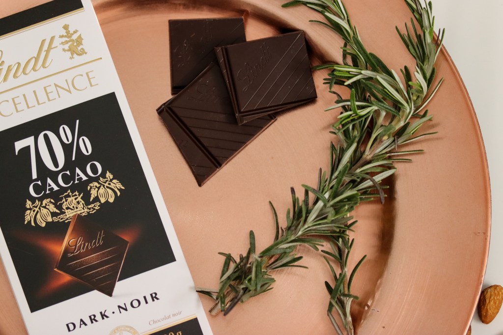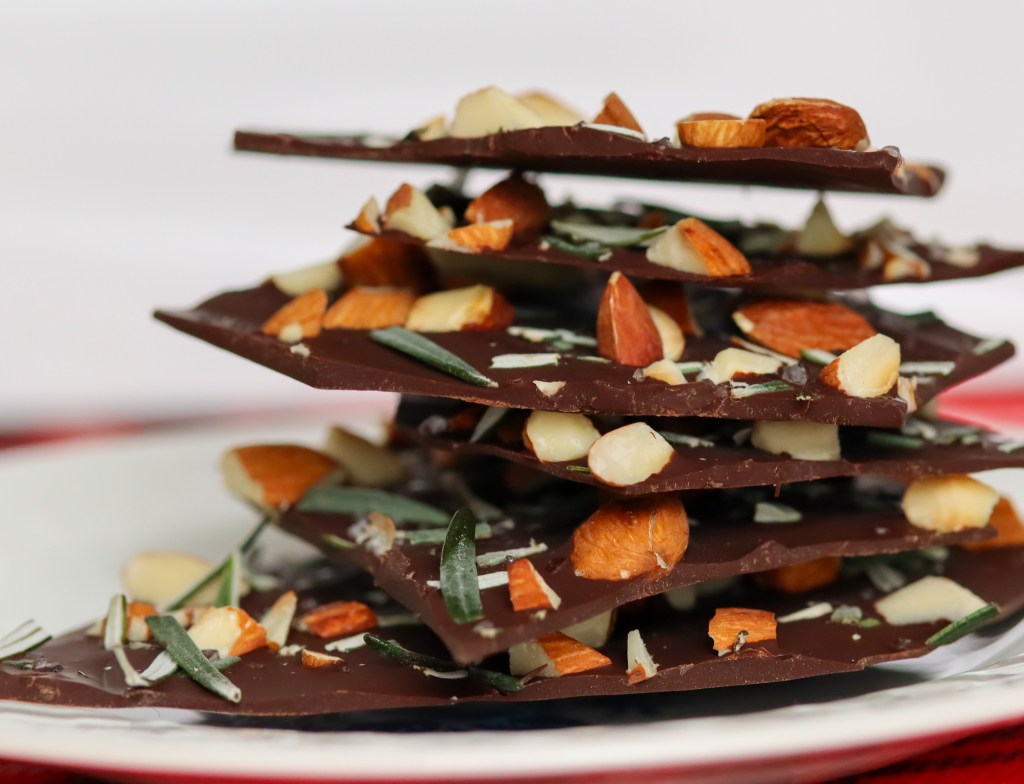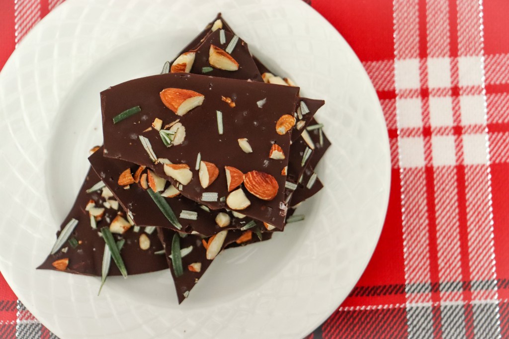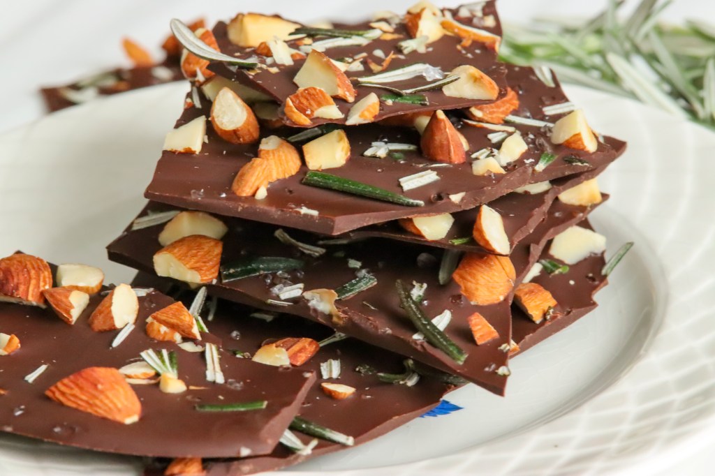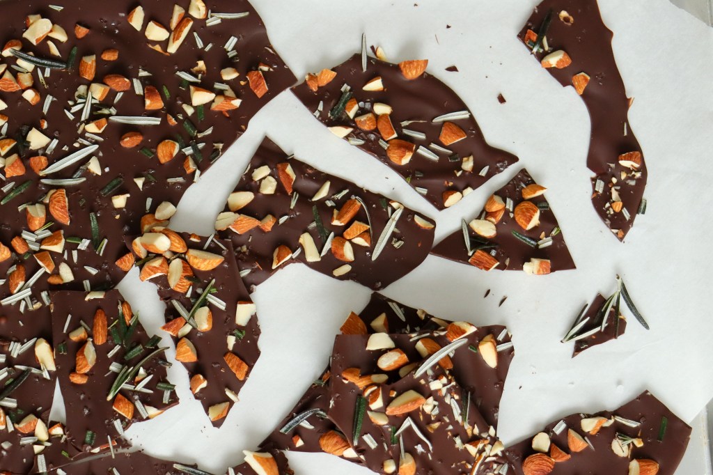 - sprinkle the rosemary, almonds, and sea salt over the chocolate.