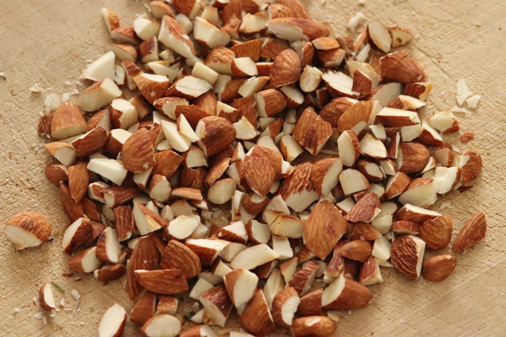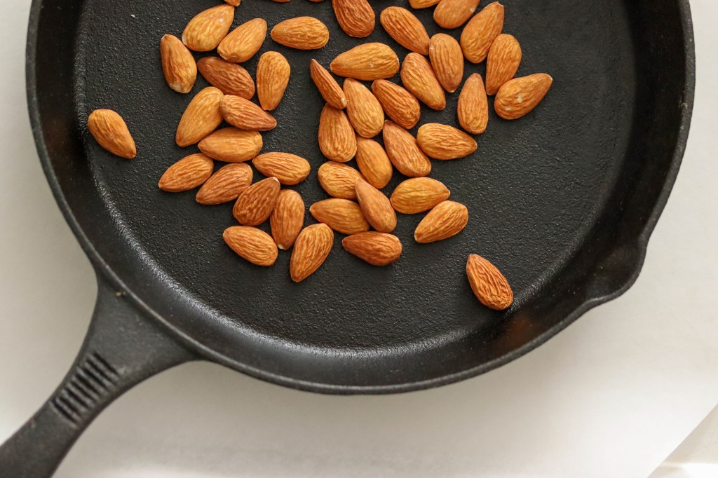 - Toast the almonds in a cast iron skillet over medium-high heat for a couple minutes until toasted. Remove from heat to cool. once cooled; chop into pieces.