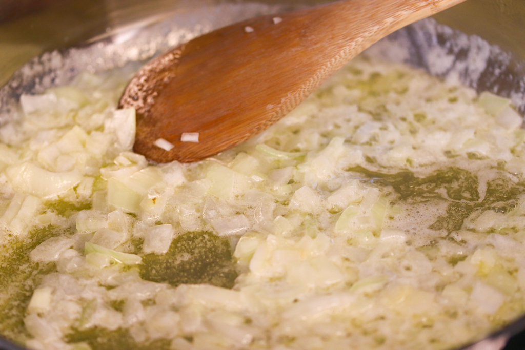 - Melt the butter in a large skillet, and throw in the chopped onions sautéing until the onions are soft.