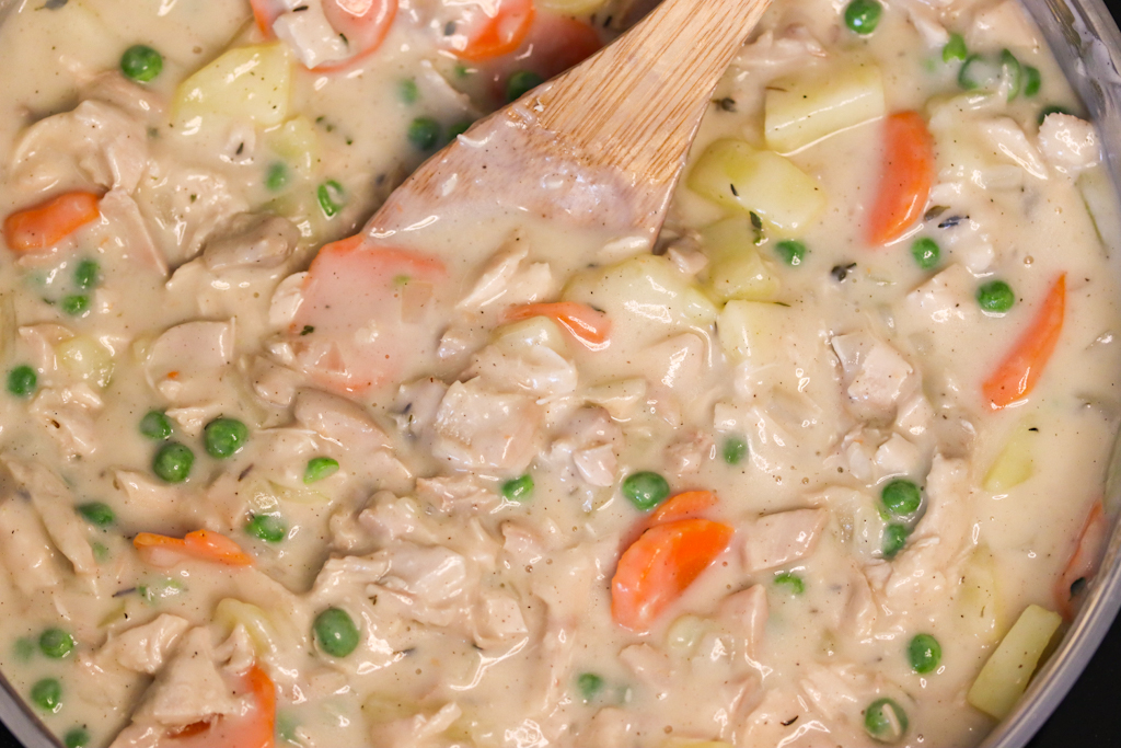 - Add potatoes, carrots, turkey, and peas. cook for 1 minute, check for seasoning and season more if desired.
