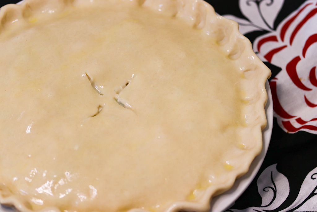 - Brush egg wash on the top of the crust and using a knife, cut 4 slits in the center so the steam can escape while cooking.