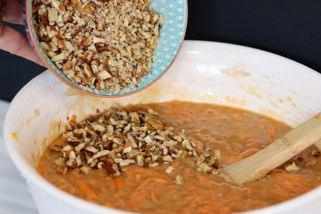 5. Stir in the shredded carrots, and 1 cup chopped pecans.