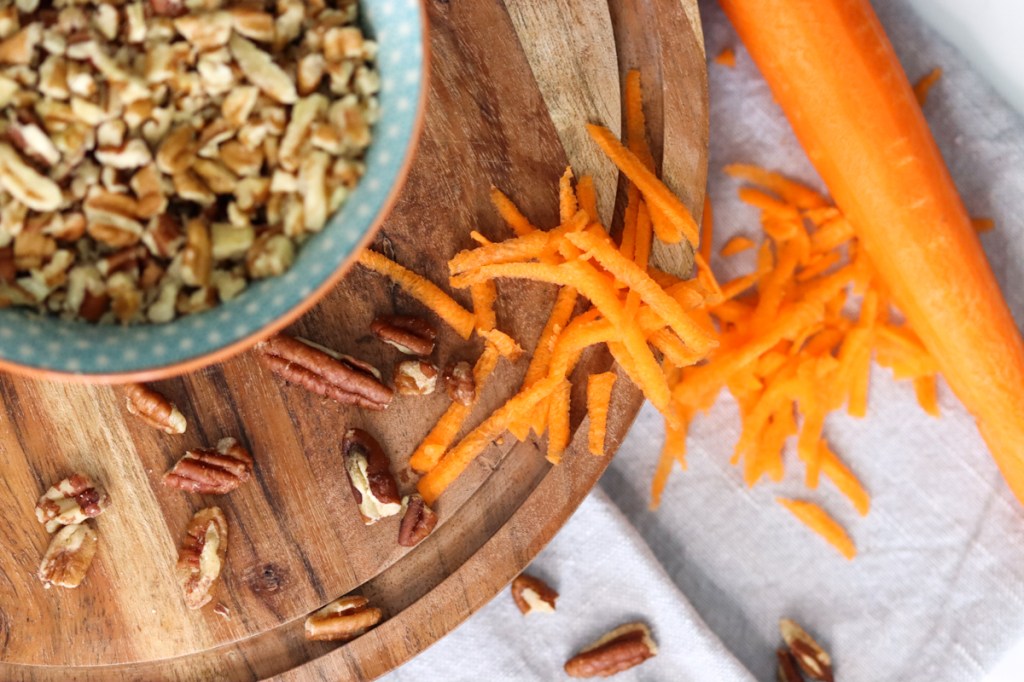 3. I recommend shredding your carrots, and chopping your pecans at this time so they are ready. I chopped my pecans a little more coarsely which made for a nice texture in the cake, but you can chop them finer if you desire.