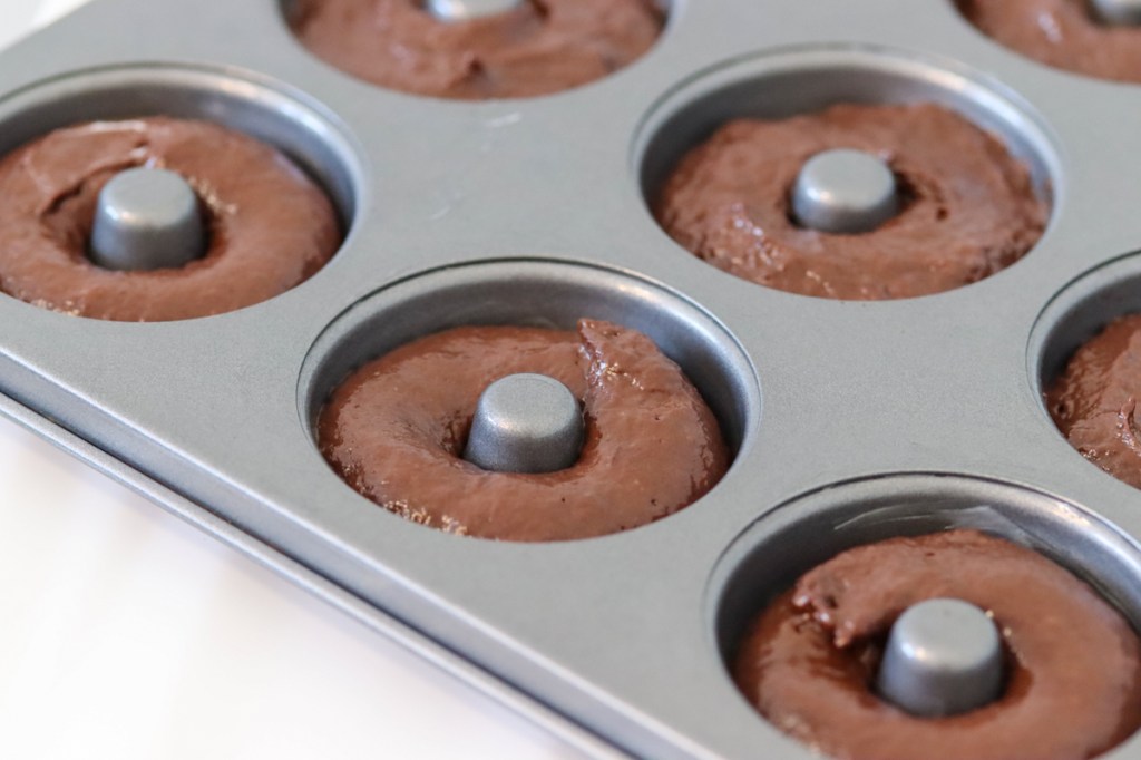- Using a piping bag; fill each of the wells of the donut pan.