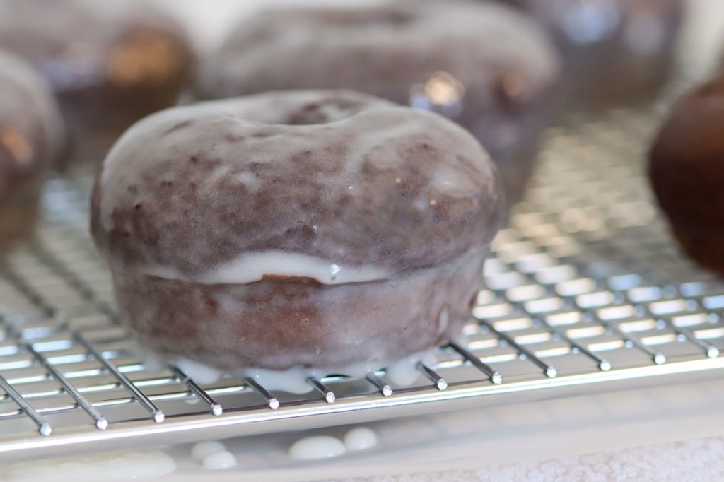 If you’re like me; you don’t like getting your fingers gooey, and lets face it, when you think about glazing a donut, messy comes to mind. Here is the best method I found for glazing the donut. Start by grasping the donut in between your fingers; one finger on top of the donut, and your thumb on the bottom. (not on the sides of the donut) Dip the side of the donut in the glaze and roll it until the sides are covered, then drop the top of the donut into the glaze. Using your index finger, insert it into the center hole of the donut as far in as you can get it, and scoop it out. Once you scoop it out of the glaze, hold it over the glazing bowl and let the excess drip off for about 30 seconds. set it back onto the cooling rack to harden. Make sure you have a sheet of parchment paper underneath the cooling rack for easy clean up, as it will drip a little bit more.