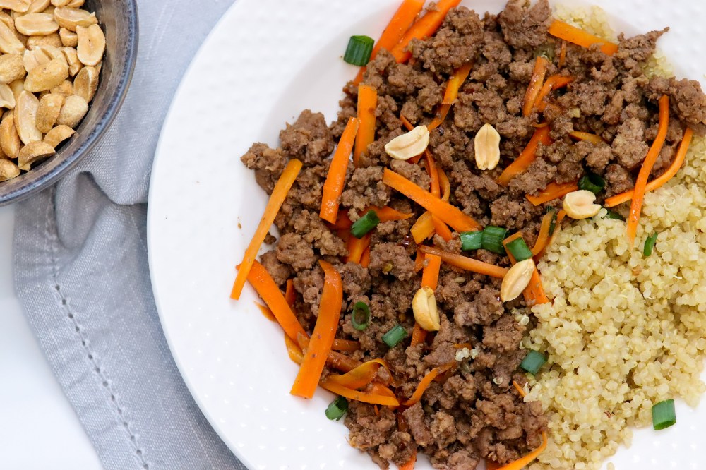 - Divide quinoa between 4 bowls, top with beef mixture and sprinkle with green onion and peanuts.