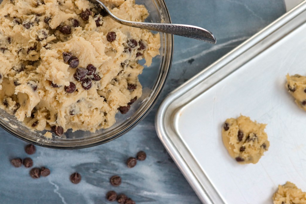 Avoid over-mixing. Cookies are a little finicky when it comes to how much you mix your dough. Its important not to over mix as over mixing will over-aerate the dough which will cause your cookies to rise and fall as they are baking. Do the minimum amount of mixing required to create a uniform dough. Stop mixing your dough when there are no more streaks of flour left in the bowl. Remember, you will be doing additional mixing as your stir in your chocolate chips.