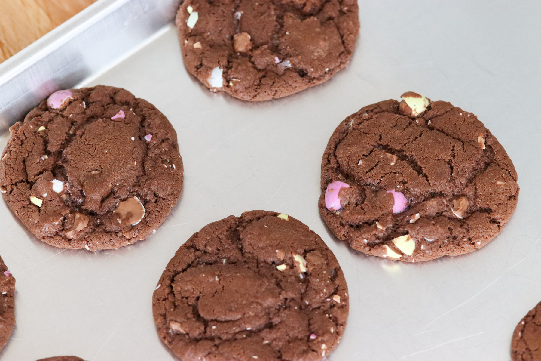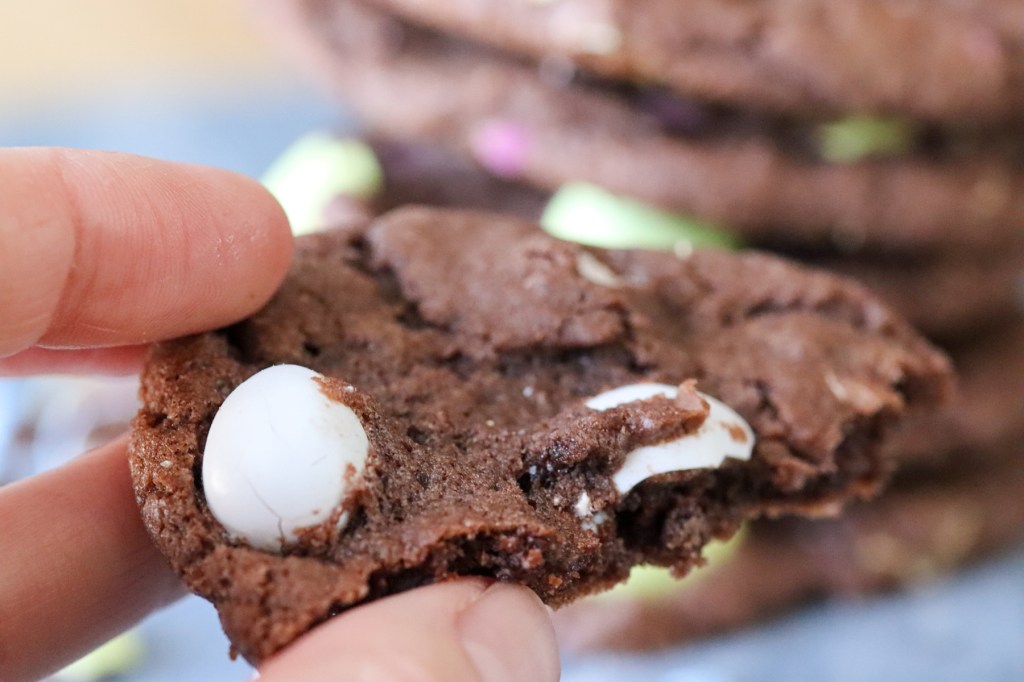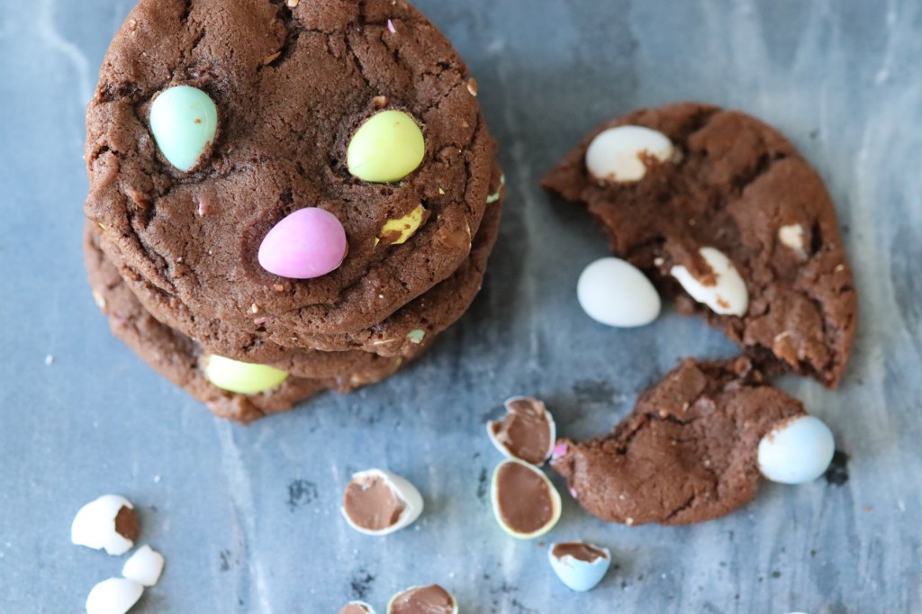 - After you drop the cookie dough on your baking sheet; top each cookie with a few whole Cadbury mini eggs for a pop of color.