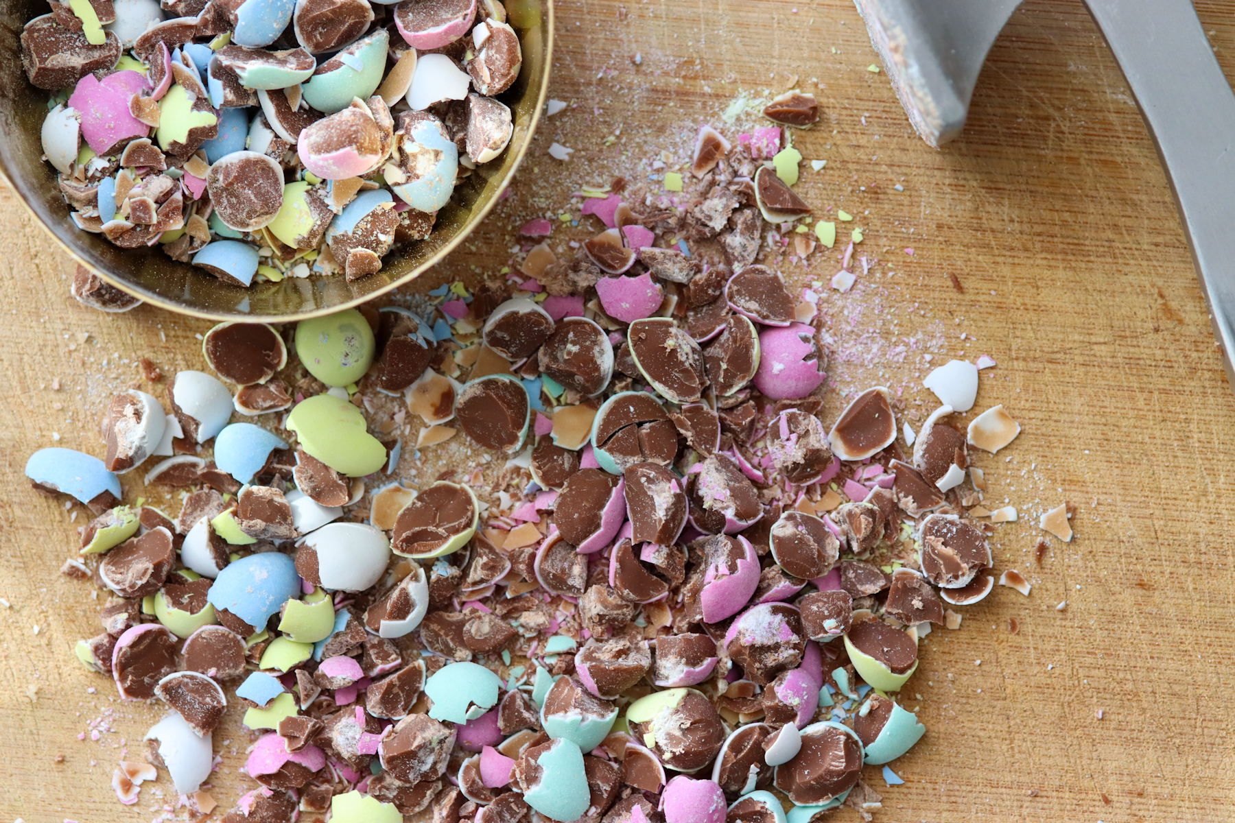- The easiest way to chop the Cadbury mini eggs is to place the candies in a zip lock bag and lightly tap them with a meat tenderizer. If you don’t have one, you can also use the underside of a bowl.