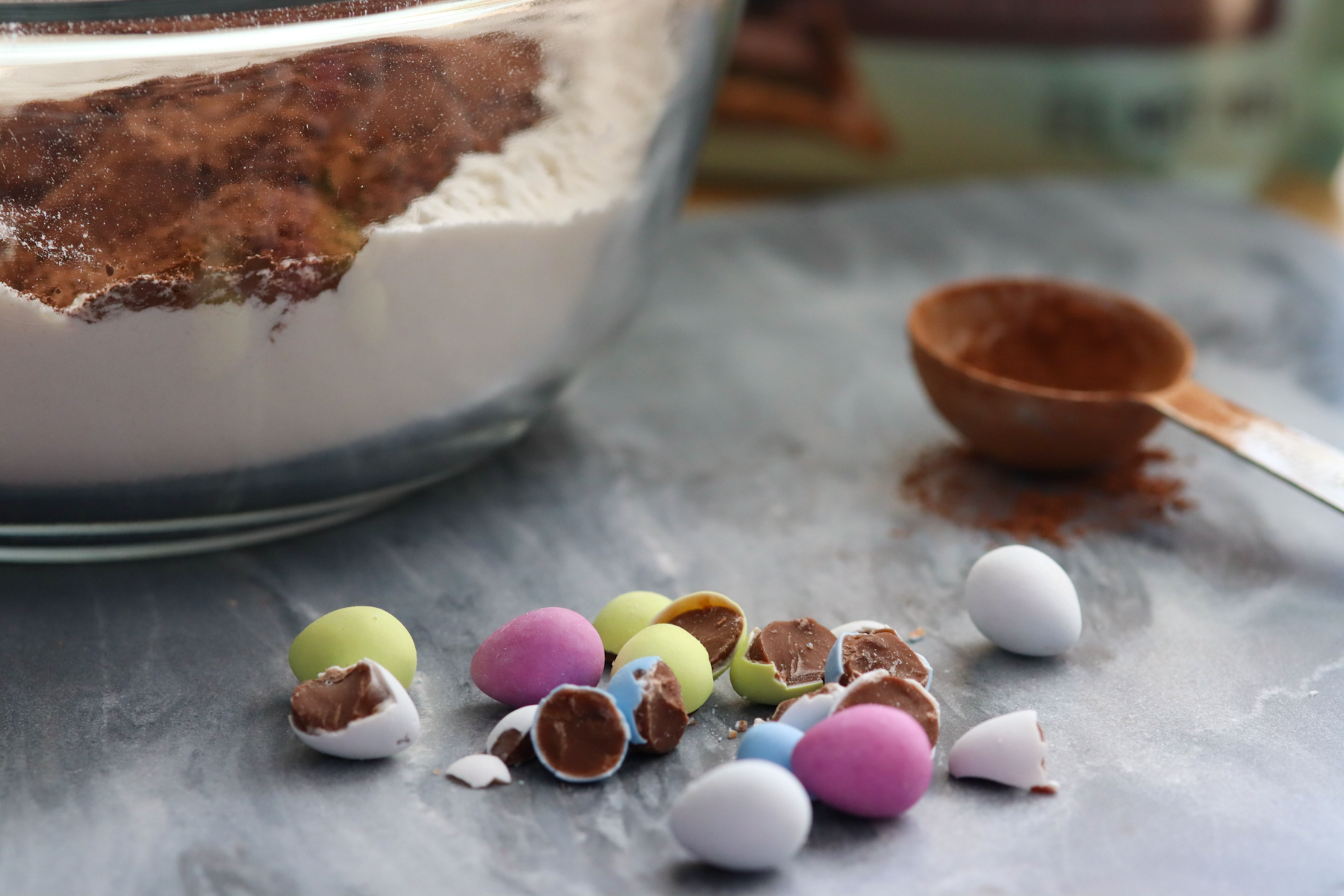 - Once you have the dough mixed together its time to add in the mini eggs! fold them in to the batter with a wooden spoon or spatula.