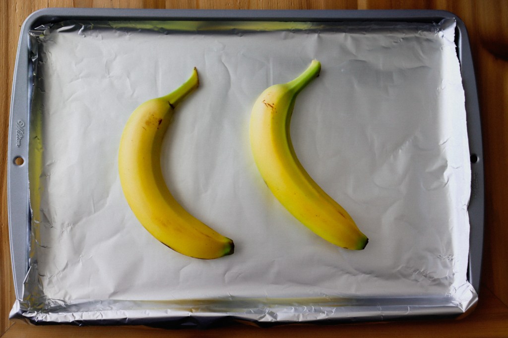 - place unpeeled bananas on an aluminum foiled lined baking sheet
