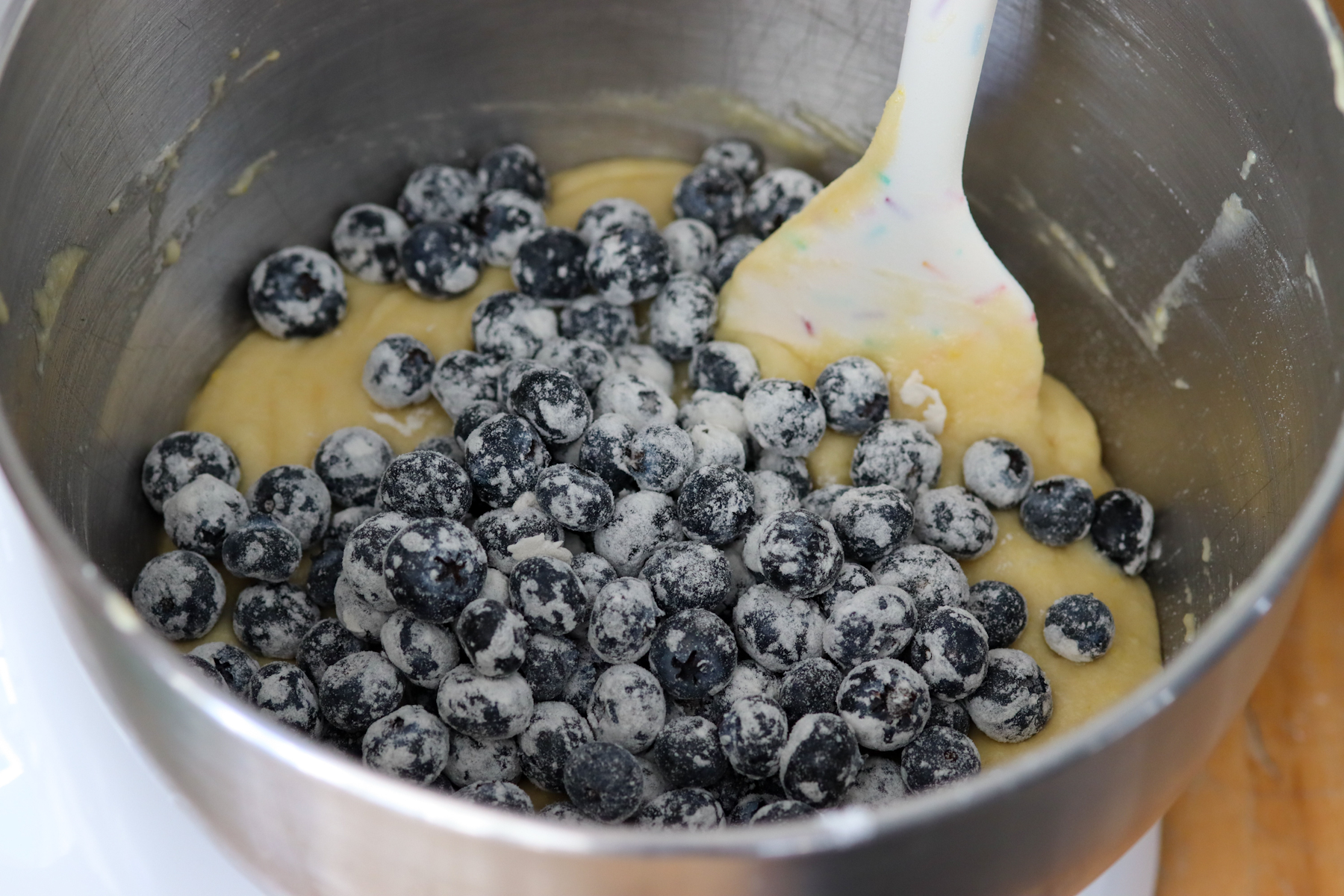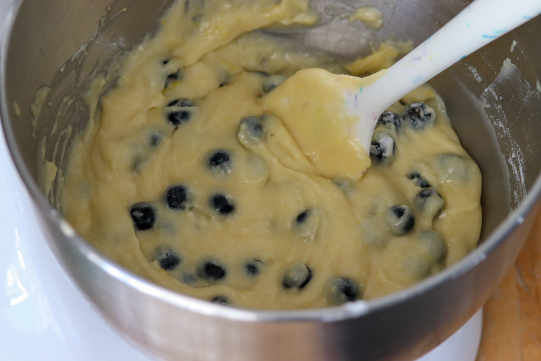 - Fold the blueberries into your batter with a rubber spatula.