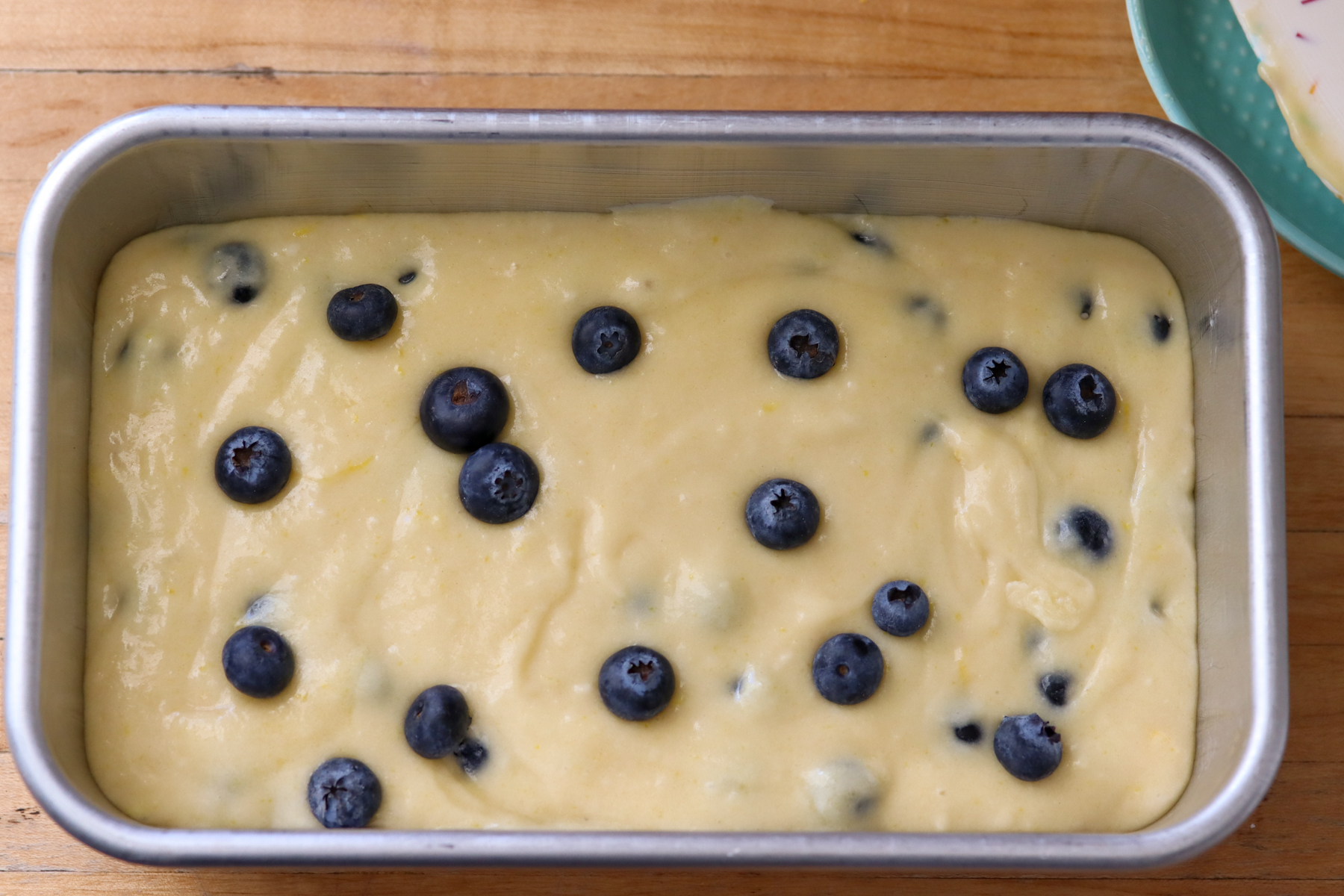 - Now pour the batter into a prepared 9”x5” baking pan and top with a couple more blueberries if desired. I like to do it because why the heck not!