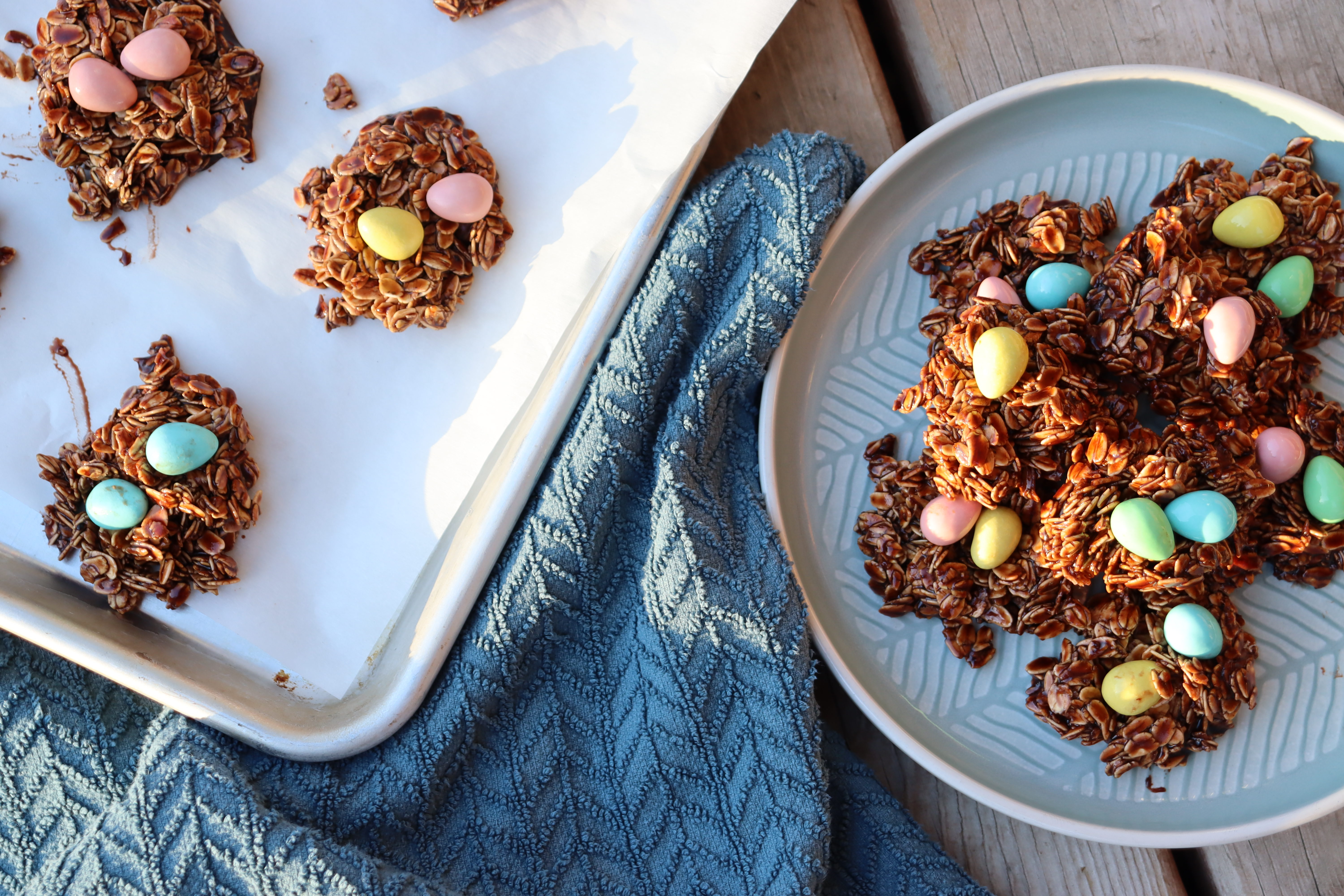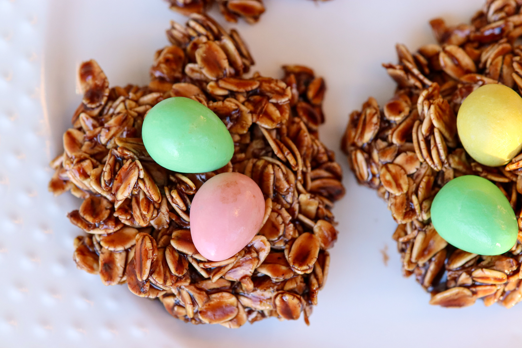 These soft, chewy, chocolate no-bake cookies made with chocolate, oatmeal, and topped with Cadbury mini eggs are the perfect easy-to-make Easter treat.