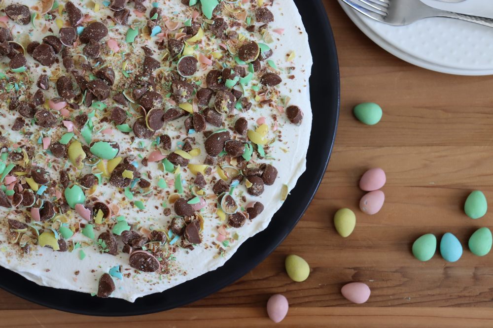 - Top with additional crushed Cadbury mini eggs and place the finished cake back in the freezer for 3 more hours or until frozen.