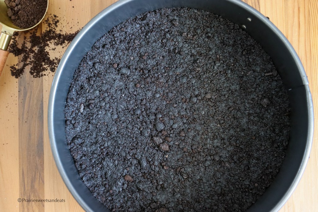 - In a small bow, combine Oreo cookie baking crumbs, and melted butter. press in the bottom of a 9″ spring foam pan. set aside in the freezer.