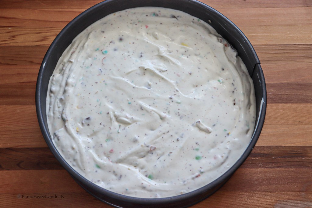 2. Next, make the ice cream filling. Pour whipping cream and vanilla into a cold bowl of your stand mixer with the whisk attachment and whip on high until stiff peeks form. About 5 minutes. Pour a can of sweetened condensed milk in and mix on low for 30 seconds just until combined. Gently fold in the crushed mini eggs using a spatula. Remove spring foam pan from the freezer and pour the ice cream filling on top of the Oreo crust and place back in the freezer for minimum of 4 hours or until mostly frozen. After a several hours, gently poke the ice cream layer with your finger, if it feels mostly frozen, and you’re not able to easily make an indent, its ready for the next layer.