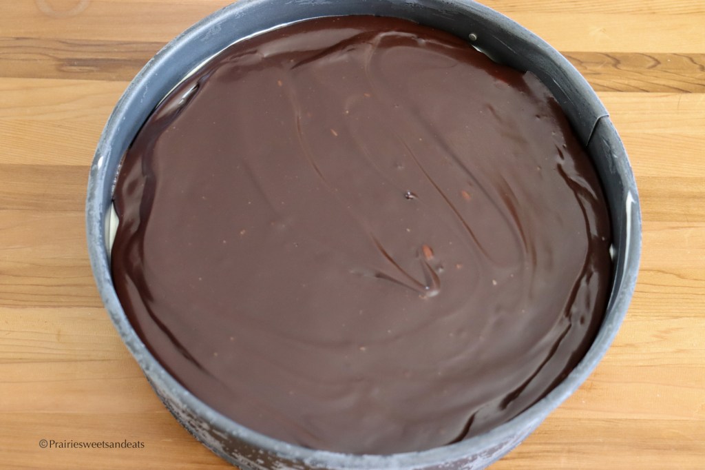 - Remove spring foam pan from the freezer and pour the ice cream filling on top of the Oreo crust and place back in the freezer for minimum of 4 hours before adding the slightly cooled hot fudge sauce on top.