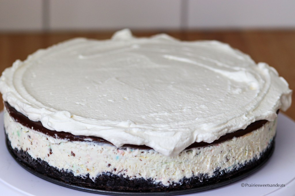 - Remove spring foam pan from the freezer and spread the whipped cream evenly on top of the fudge layer.