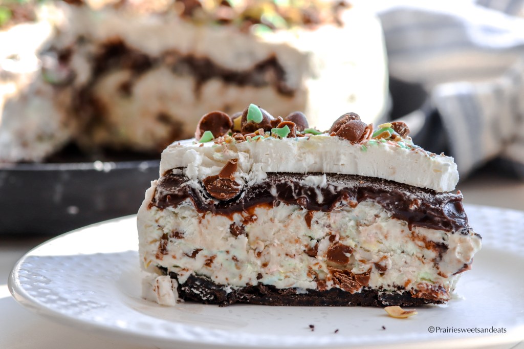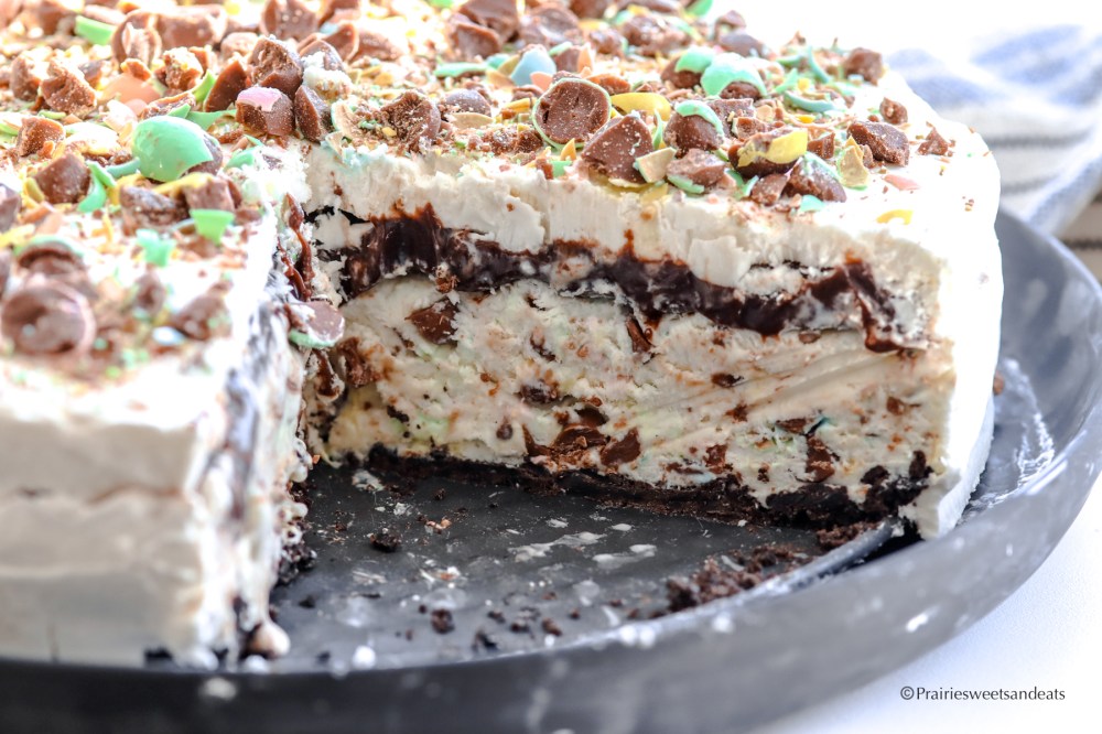 Rich, decadent ice cream cake with no churned ice cream, homemade hot fudge sauce, topped with whipped cream and Cadbury mini eggs is the ultimate treat for the sweet tooth in the family.