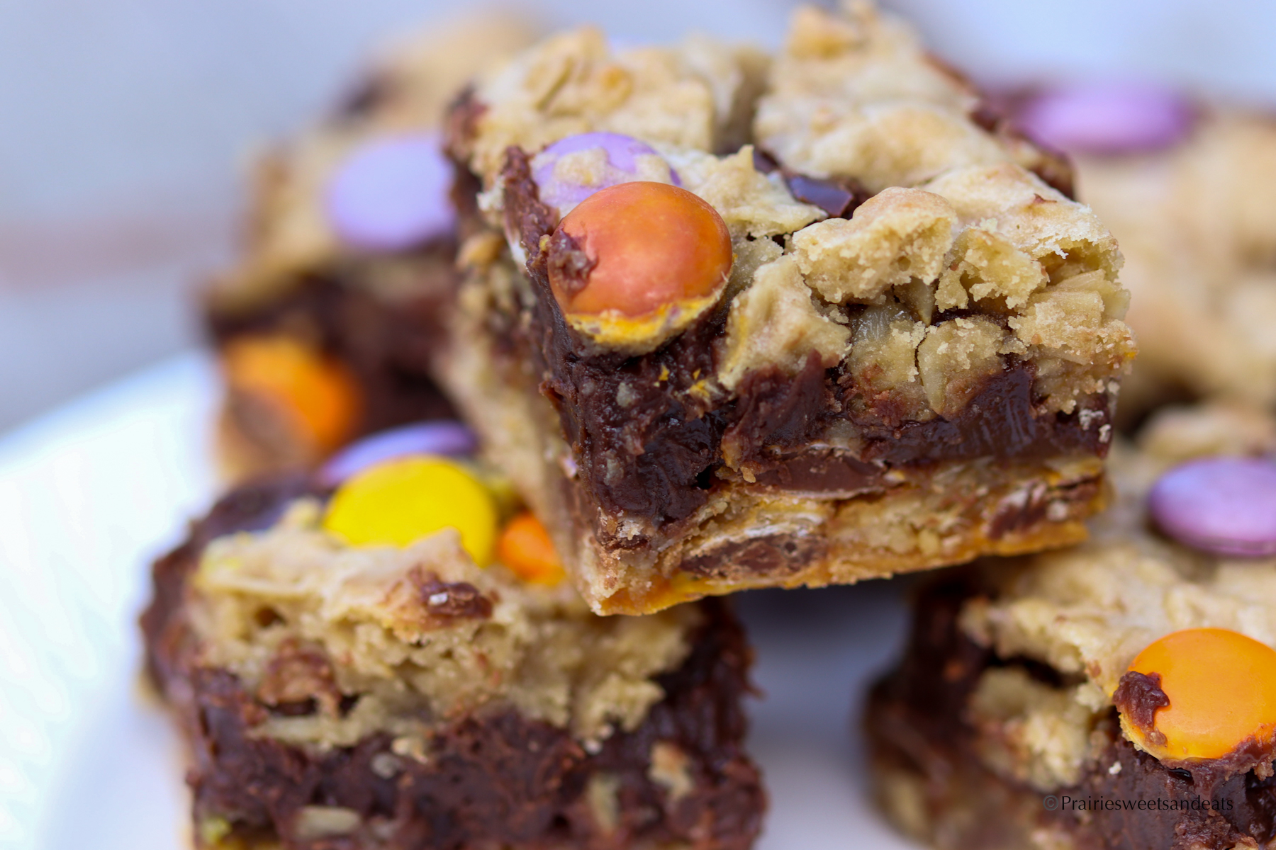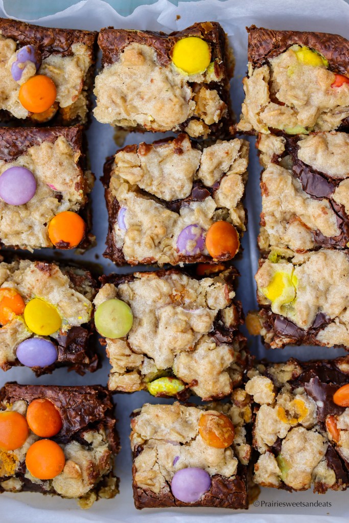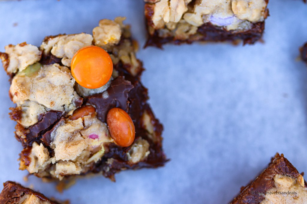- Now we want to make the oat mixture. Melt the butter in the microwave in short intervals stirring in between each interval. Once the butter is melted, pour it into a large bowl along with the brown sugar, egg, vanilla extract and salt, and whisk together until smooth. Stir in the flour with a rubber spatula or wooden spoon just until combined. (there should be a few flour streaks left) stir in the oats and candy pieces.