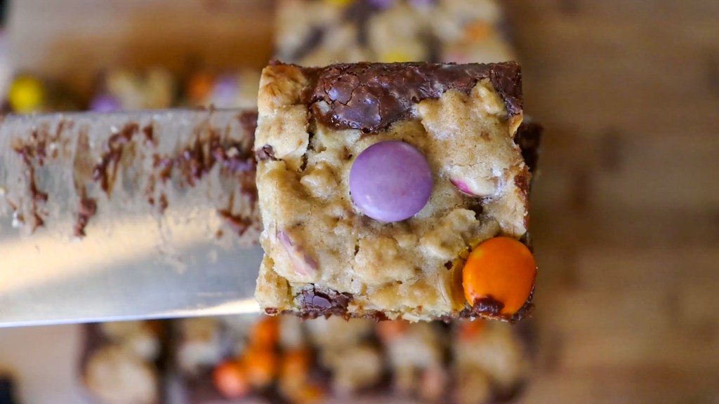 - Stir in flour just until combined, stir in oats and candy pieces.