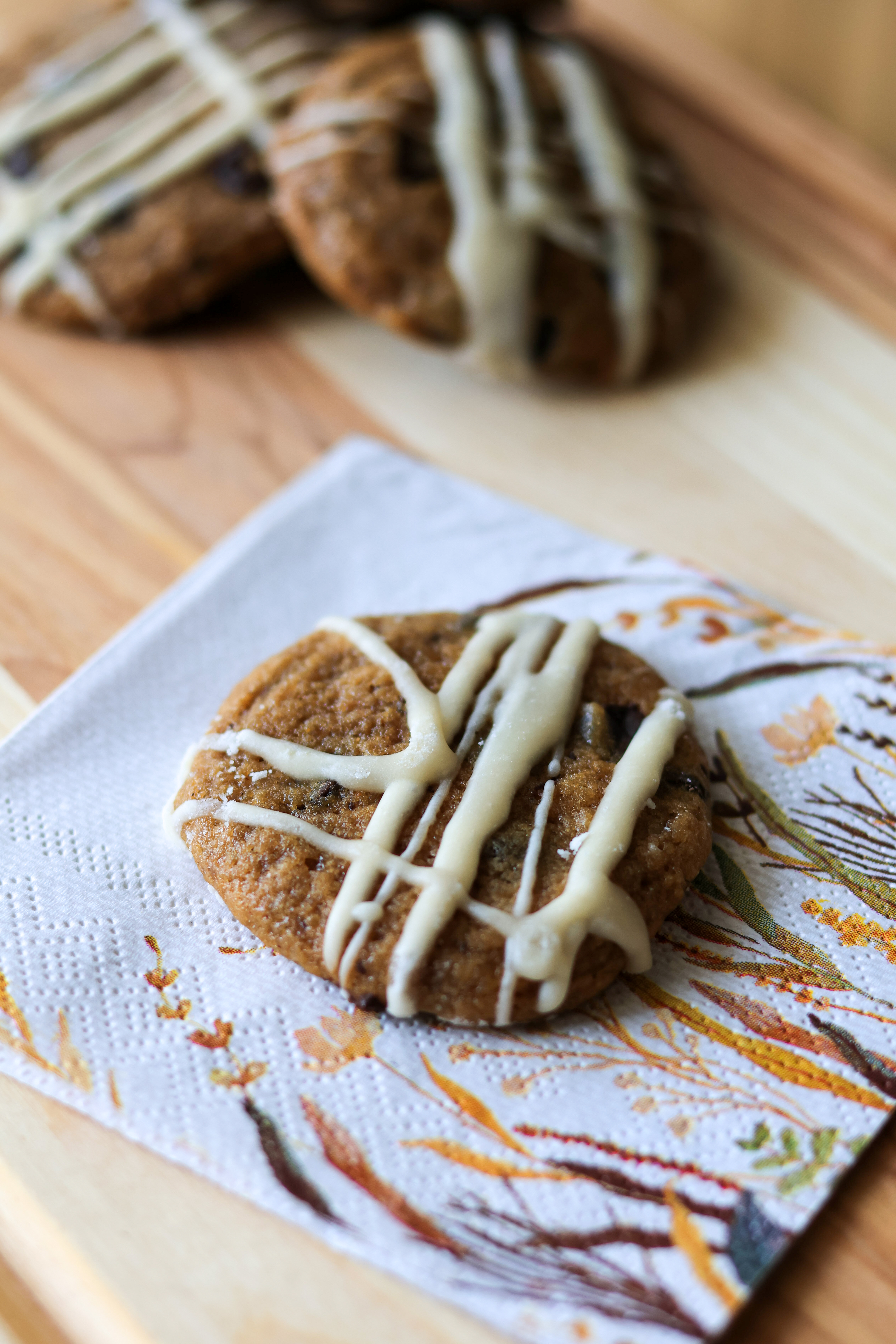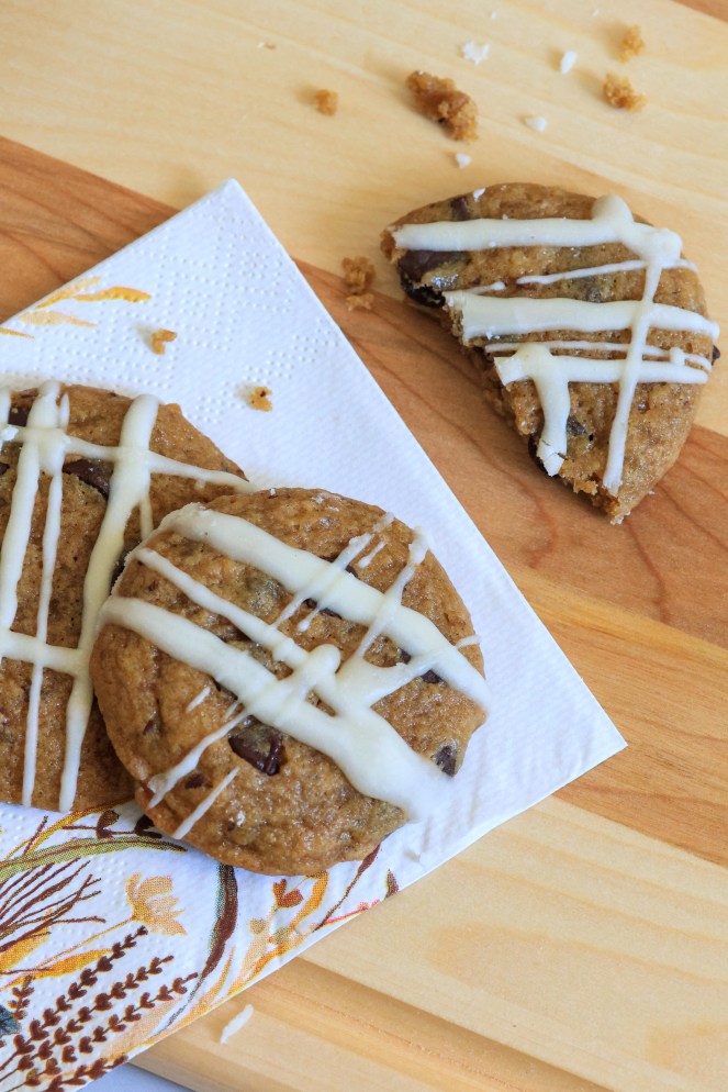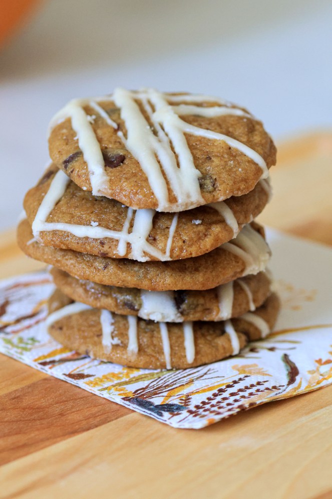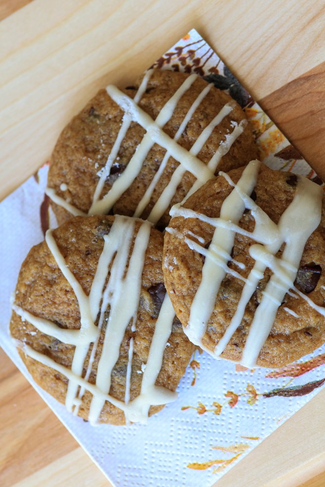 Listen to me when I tell you that you HAVE to make these cookies. not only do they look impressive, they are incredibly soft and moist on the inside. The warm rich brown butter, paired with pumpkin, and chocolate… ohhh and that not too sweet, maple icing.. seriously, you need to have these in your freezer!