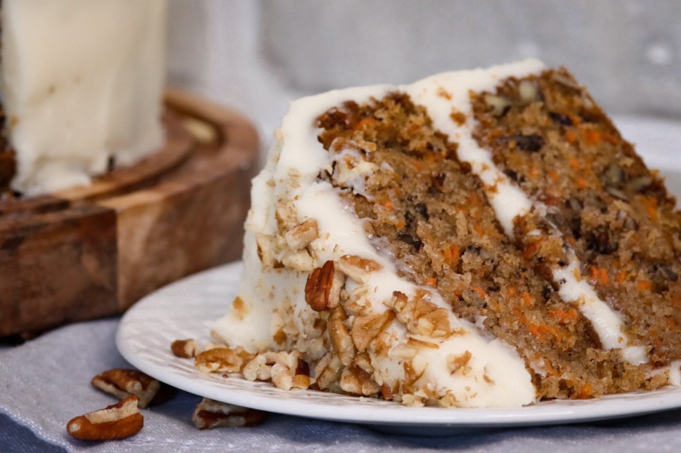 A delicate soft carrot cake with warm flavors, topped with a classic cream cheese frosting.