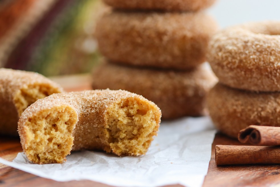 Soft, moist pumpkin donuts with warm spices coated in cinnamon and sugar.